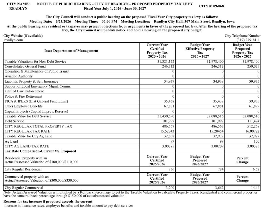 A Public Hearing is set for Monday, March 23, 2026, at 6:00 PM in the Readlyn City Hall, 307 Main Street, Readlyn, Iowa, regarding the Proposed Property Tax Levy for FY 2027. (Posted 3/17/2026)