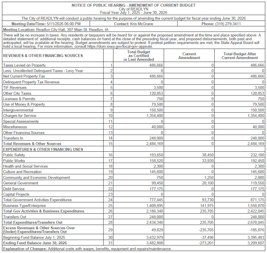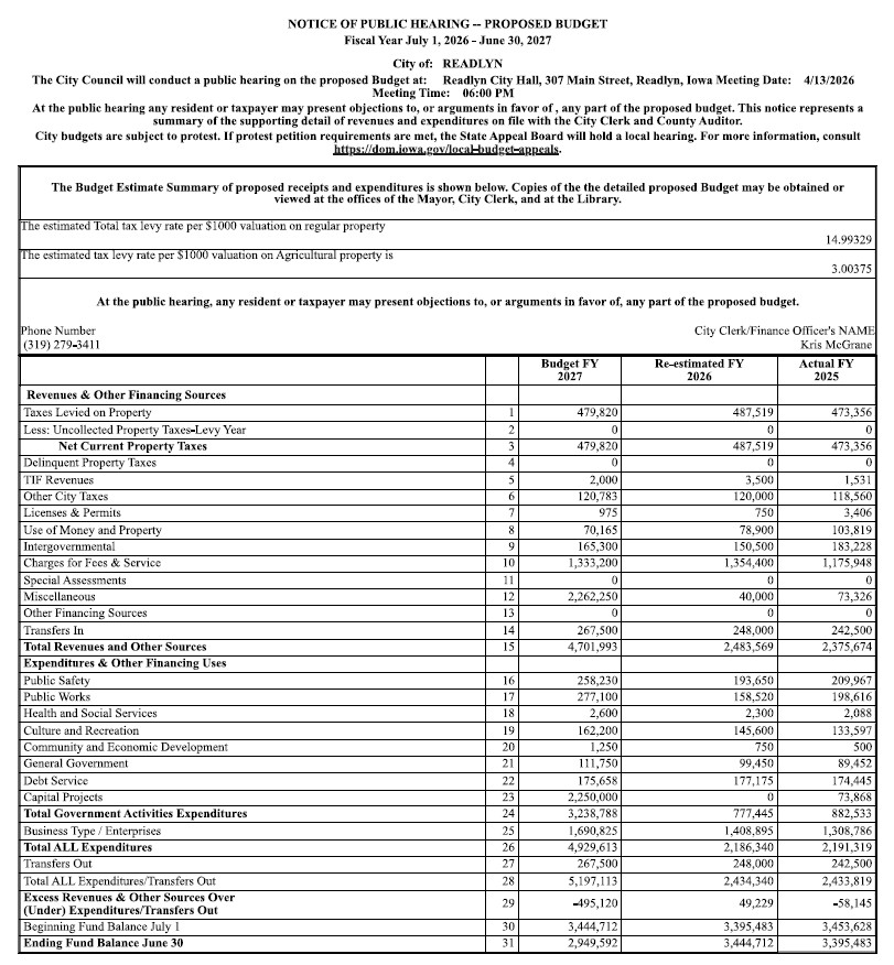 A Public Hearing is set for Monday, April 13, 2026, at 6:00 PM in the Readlyn City Hall, 307 Main Street, Readlyn, Iowa, regarding the Proposed Budget for FY 2027. (Posted 4/1/2026)